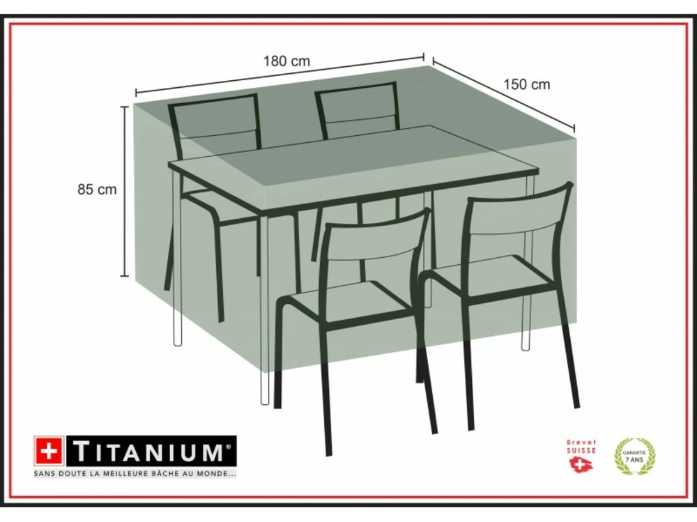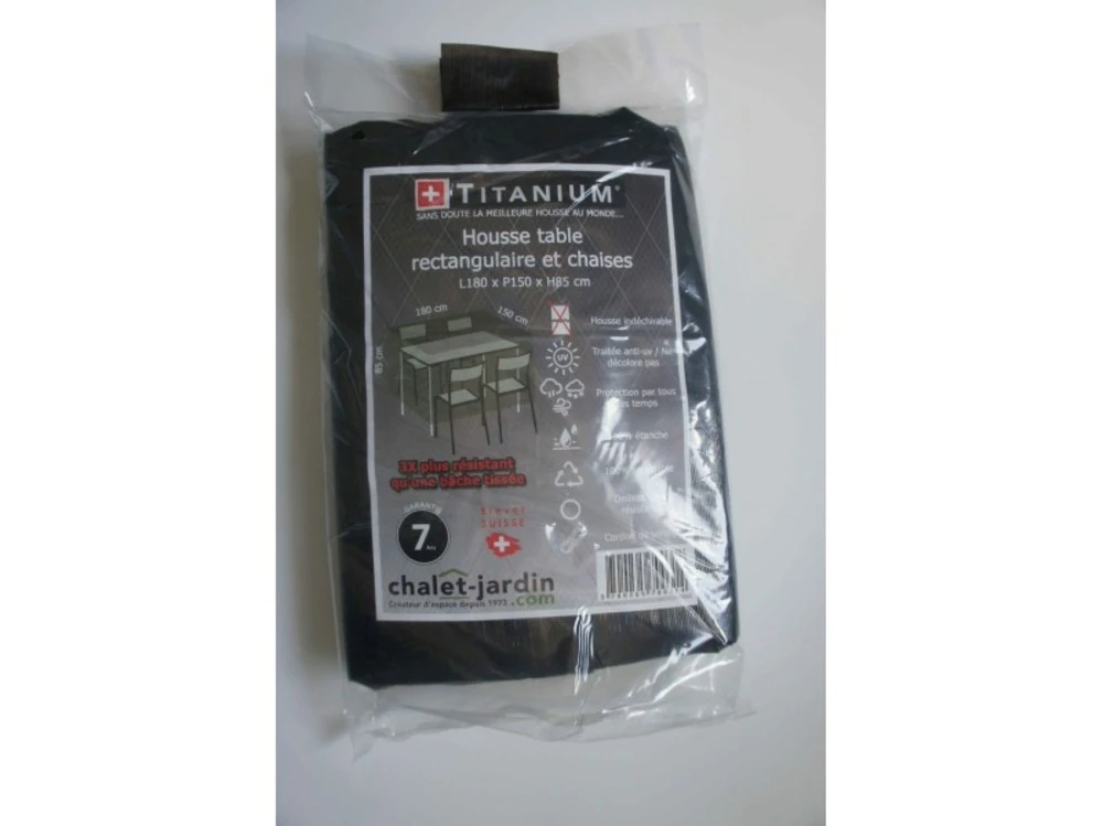 Techniquesdimensions ext. Hors tout (l x p x h) : 180 x 150 x 85 cmgrammage : 90 g/m ²matiã¨re : polyã©thylã¨necoloris : noir rayã© blancinclus : cordon de serrage ultra rã©sistantssouple et lã©gã¨re / 100 % recyclable / 100 % ã©tanche ã l’eau, ã la poussiã¨re et aux uv / rã©siste aux changements de tempã©ratures et ã de nombreux produits chimiquescolis dimensions : 40 x 30 x 40 cm poids : 0,820 kgcette housse de protection pour votre table rectangulaire et vos chaises vous permettra de protã©ger votre mobilier en le gardant au sec et ã l’abri des intempã©ries. Cette housse de protection bã©nã©ficie d’un procã©dã© ultrasonique pour une meilleure rã©sistance, systã¨me brevetã© (suisse).avantages : ultra rã©sistant, technologique, opaque, traitã© pour une protection uv, pratique, ne nã©cessite aucun entretien
