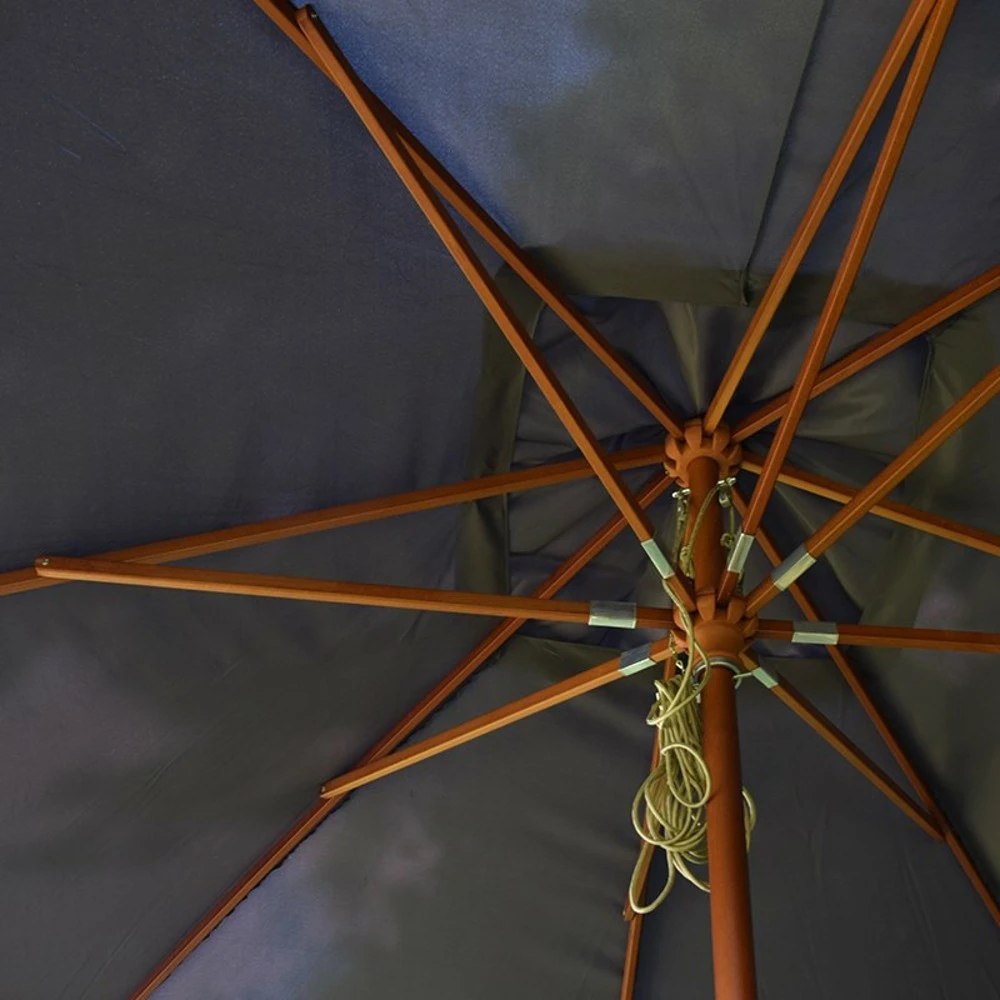 parasol avec mât central en bois et toile en polyester rĂ©sistante Ă l’eau Ă choisir dans un coloris assorti Ă votre mobilier de jardin.