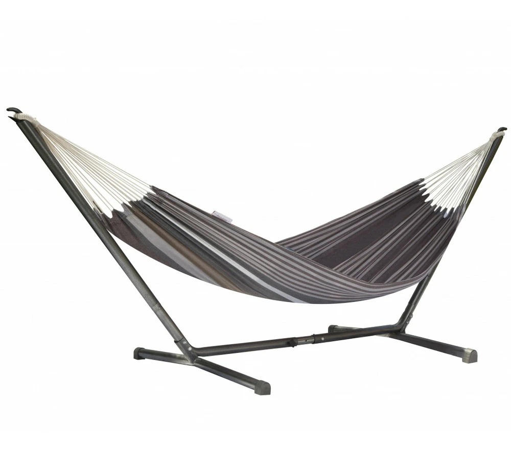 le hamac simple classique associé à son support métal au meilleur rapport qualité prix. Rien n’est sacrifié au prix : ce hamac est de bonne facture, livré avec une housse de rangement dans le même tissus et un support à la finition robuste.